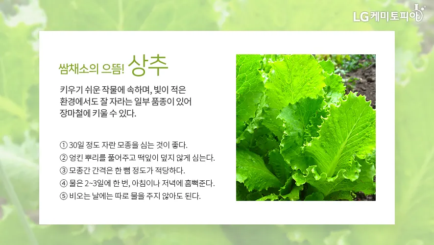 상추는 여름용 품종을 선택하는 게 핵심이에요. '하청상추', '선봉상추' 같은 내서성 품종은 35℃까지도 견뎌내거든요. 파종은 7일 간격으로 조금씩 하는 게 좋아요.