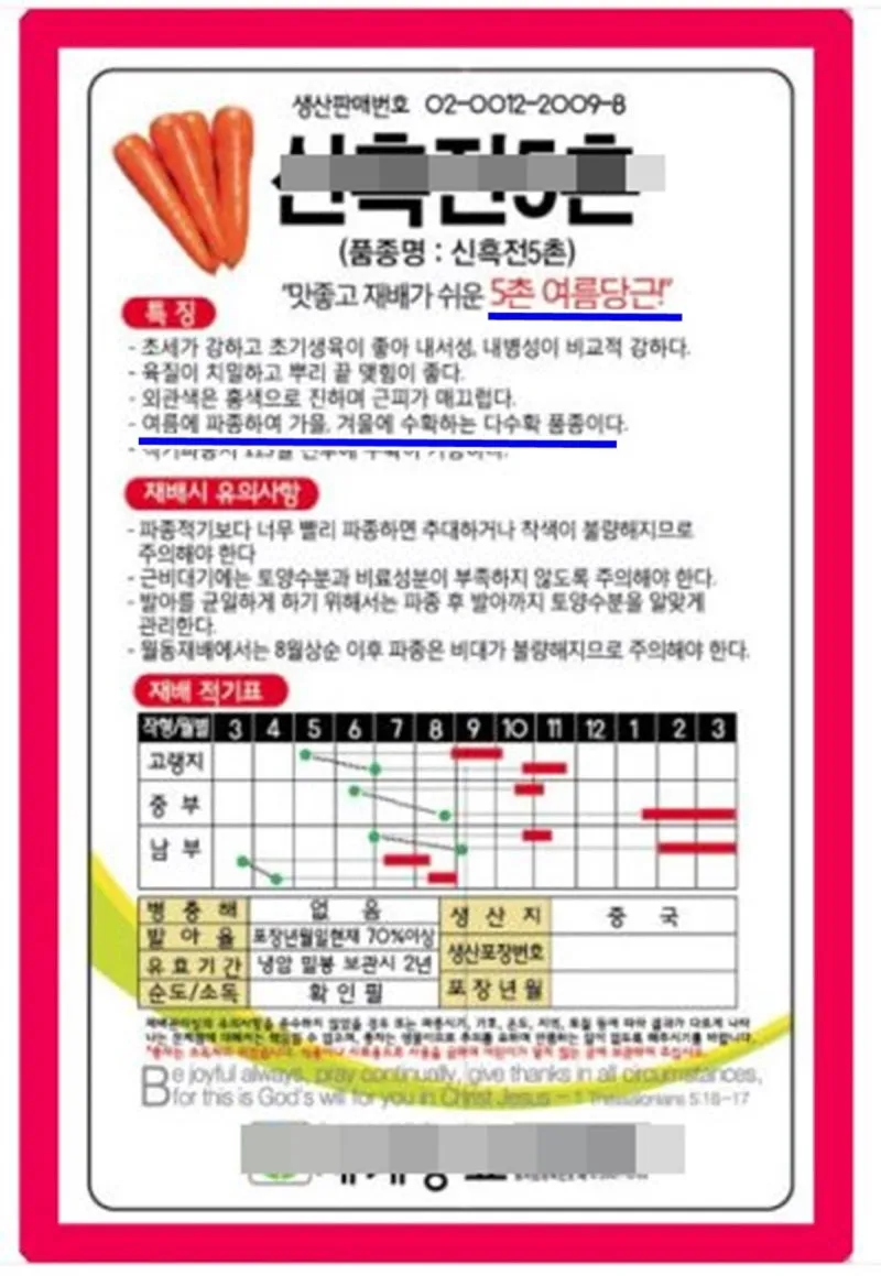 씨앗 선택할 때 주의할 점이 있어요. 당근 씨앗은 채종 후 12개월 이내의 것이 발아율이 좋으며 그 이후에는 현저히 발아율이 떨어집니다. 반드시 채종 날짜를 확인하세요!